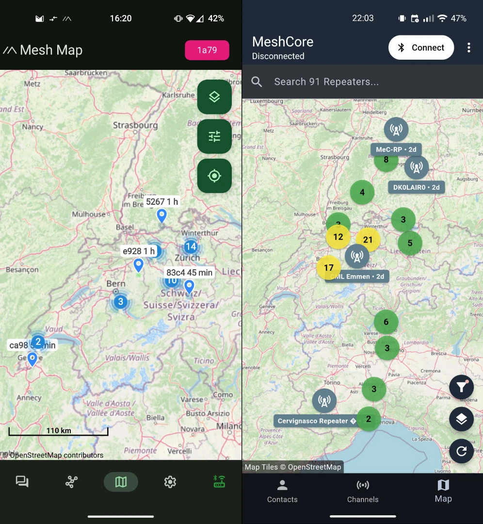And if you’re curious why I prefer meshcore, these are all the nodes I was able to hear on meshtastic and meshcore, respectively, in the same location, with meshcore I can reach twice as far in each direction