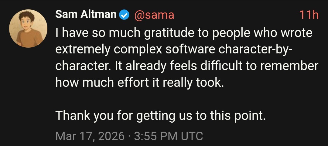Hey Sam, just so you know, if I do get laid off, I am going to charge at LEAST double when some of these assholes need to hire me back to fix the AI generated disaster they’re struggling to keep running while bleeding money. So thank you in advance, I guess.