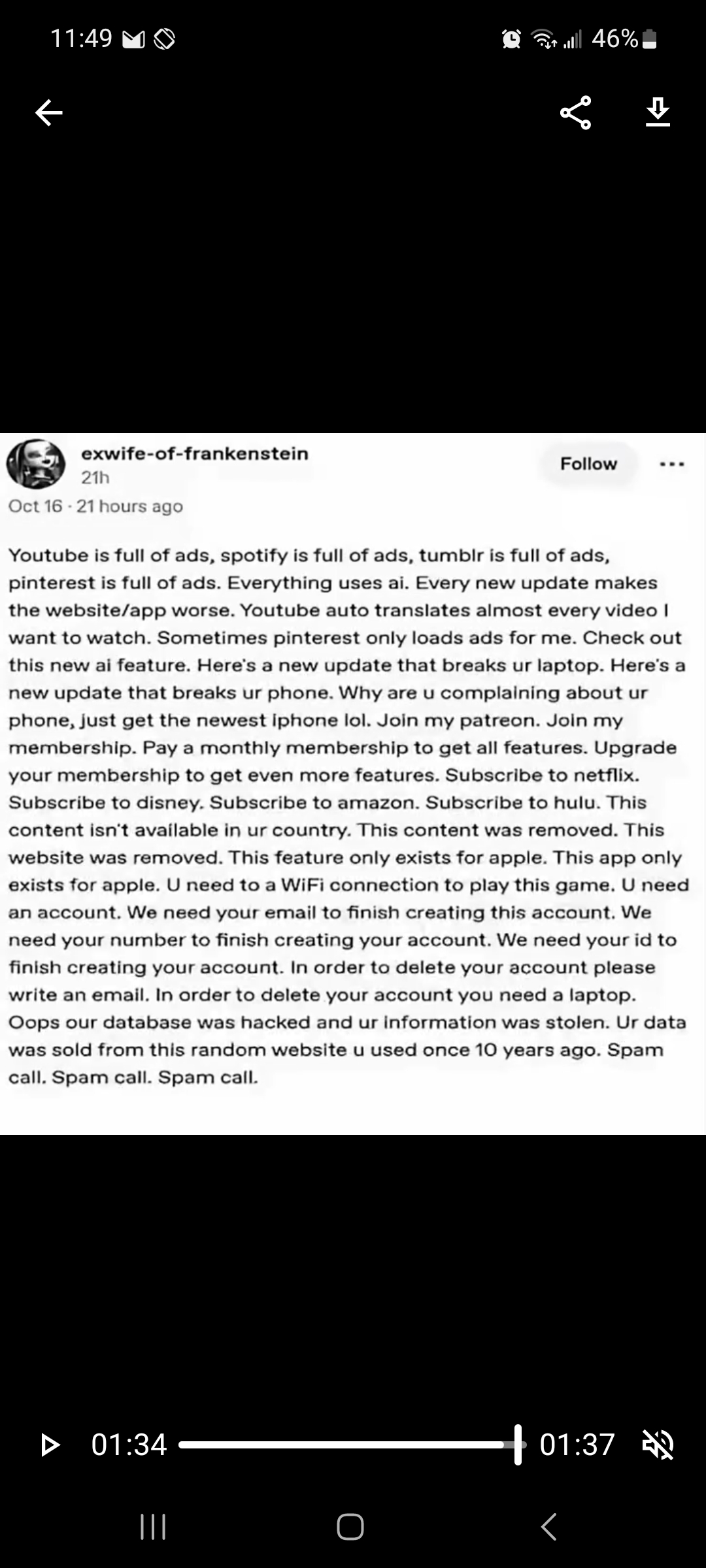 Youtube is full of ads, spotify is full of ads, tumblr is full of ads, pinterest is full of ads. Everything uses ai. Every new update makes the website/app worse. Youtube auto translates almost every video I want to watch. Sometimes pinterest only loads ads for me. Check out this new ai feature. Here’s a new update that breaks ur laptop. Here’s a new update that breaks ur phone. Why are u complaining about ur phone, Just get the newest iphone lol. Join my patreon. Joln my membership. Pay a monthly membership to get all features. Upgrade your membership to get even more features. Subscribe to netflix. Subscribe to disney. Subscribe to amazon. Subscribe to hulu. This content isn’t available in ur country. This content was removed. This website was removed. This feature only exists for apple. This app only exists for apple. U need to a WiFi connection to play this game. U need an account. We need your email to finish creating this account. We need your number to finish creating your account. We need your id to finish creating your account. In order to delete your account please write an email. In order to delete your account you need a laptop. Oops our database was hacked and ur information was stolen. Ur data was sold from this random website u used once 10 years ago. Spam call. Spam call. Spam call.