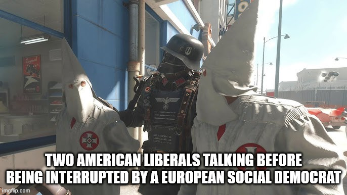 Does anyone have that Wolfenstein meme of the two klansmen and a nazi soldier talking, and the caption is something like “two American liberals talking before being interrupted by a european social democrat?” I can’t find it