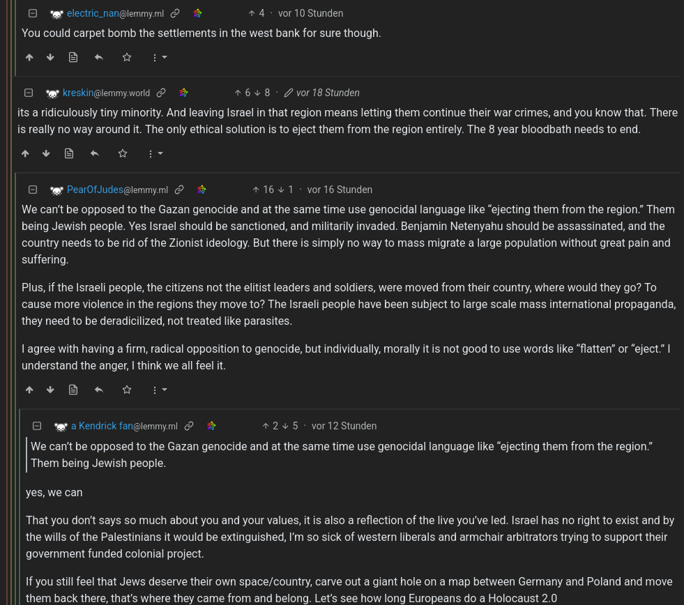 In this thread 3 separate users are in favor of war crimes on civilians and genocide, while the fourth argues against it by limiting themselves to favor extrajudicial killing, within a single conversation. It doesn’t sound very hyperbolic. https://lemmy.world/post/44949285