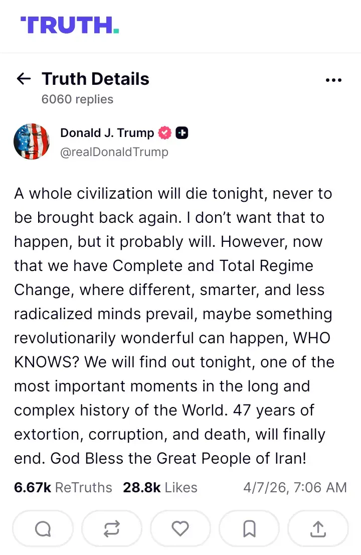 U.S. President Donald Trump said in a social media post this morning that “a whole civilization will die tonight, never to be brought back again,” as his threatened attacks on Iranian infrastructure loom ahead of an 8 p.m. ET deadline.