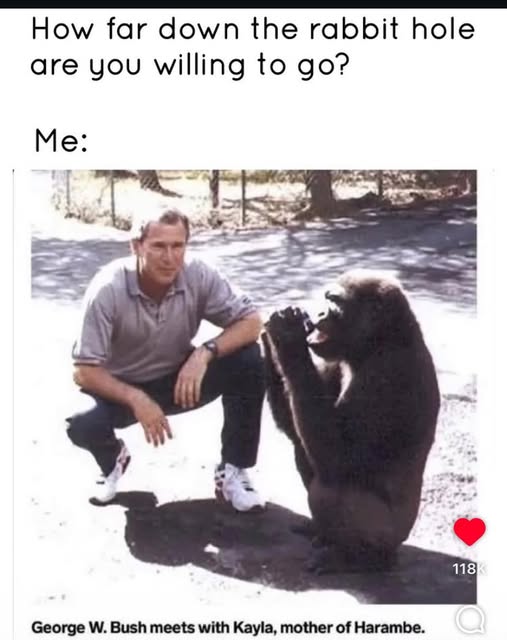 George Bush meeting with Harambe’s mother in 1999. I don’t know what the conspiracy is, but damn it makes me feel weird to see this.
