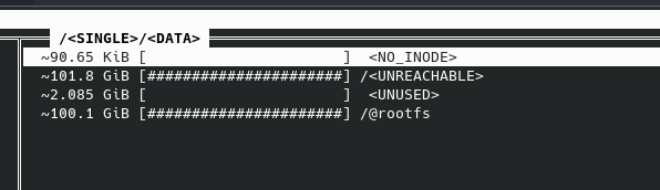 UNREACHABLEis nowUNUSED, and my disk space is back to normal:Thanks for the wiki link, Btrfs is new to me and I’ve definitely got some learning to do