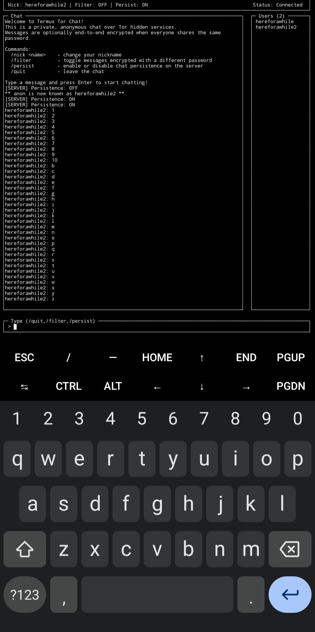 -Ability to turn on persistent rooms. By default, the server only relays in real time. /persist turns on chat logs. The server then stores encrypted messages and users can chat asynchronously.