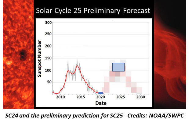 The new cycle is expected to start late in 2019 or in 2020, with solar maximum to be reached between 2023 and 2026 and the maximum (smoothed) sunspot number in the 95 to 130 range.